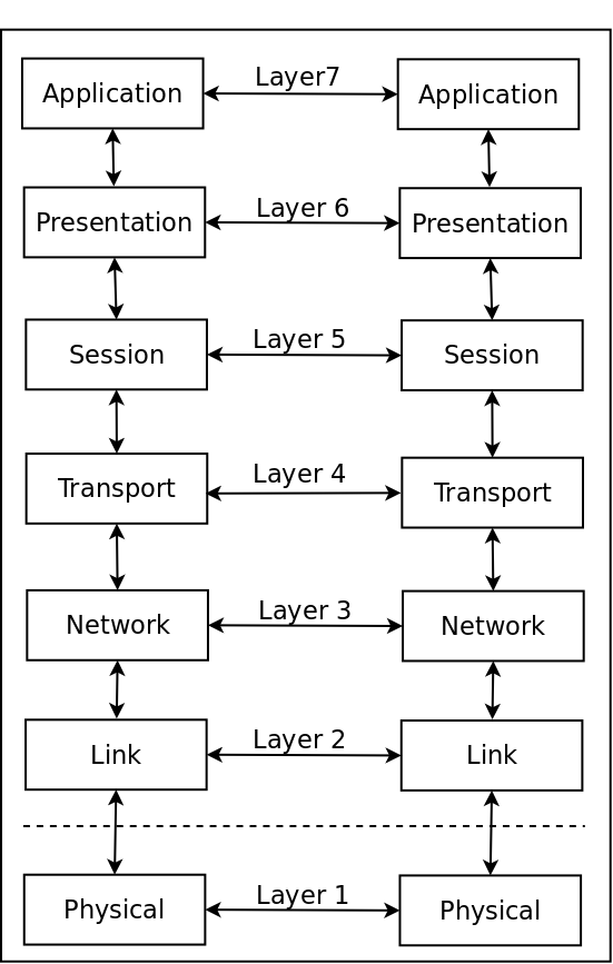 The solid line connecting the boxes marked “Physical” is the only physical connection between the computers (with the understanding that this “physical” connection may also be infrared or wireless). The arrows and dotted lines linking the other six levels, which are all implemented in software, show the logical data path.